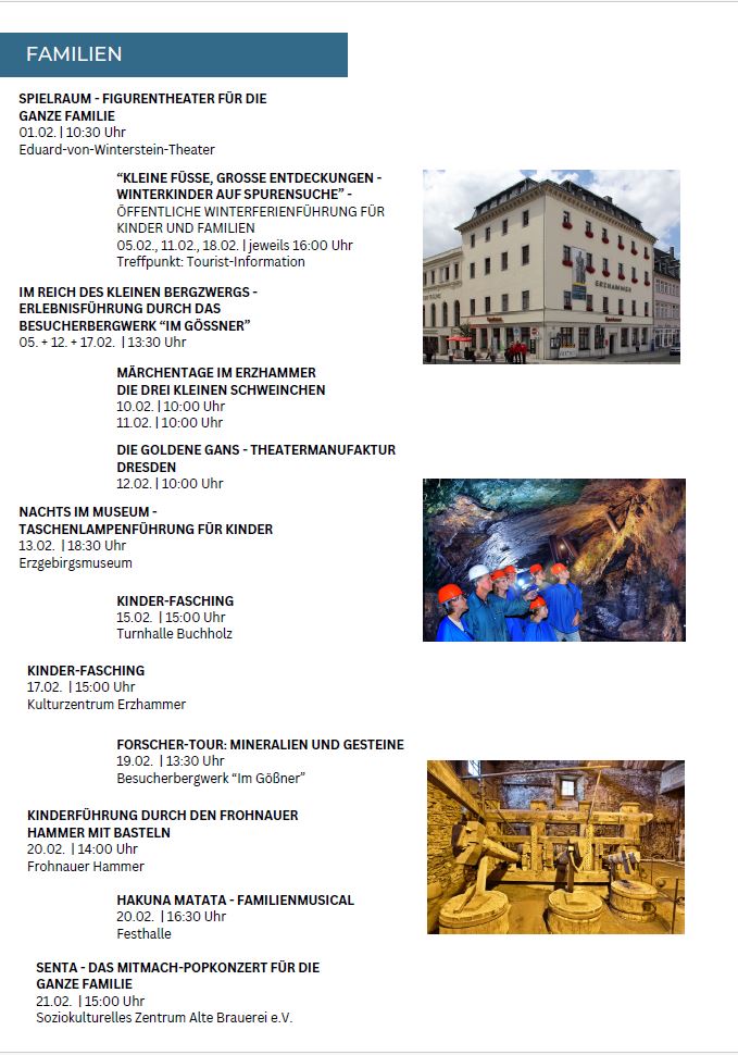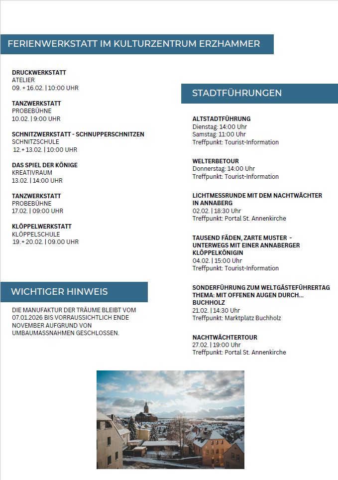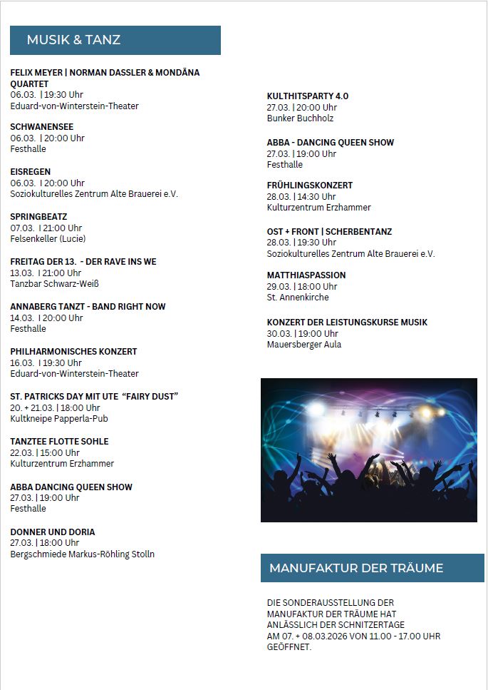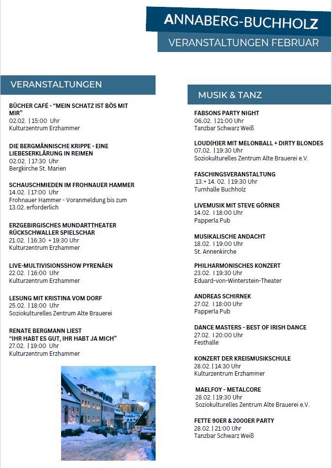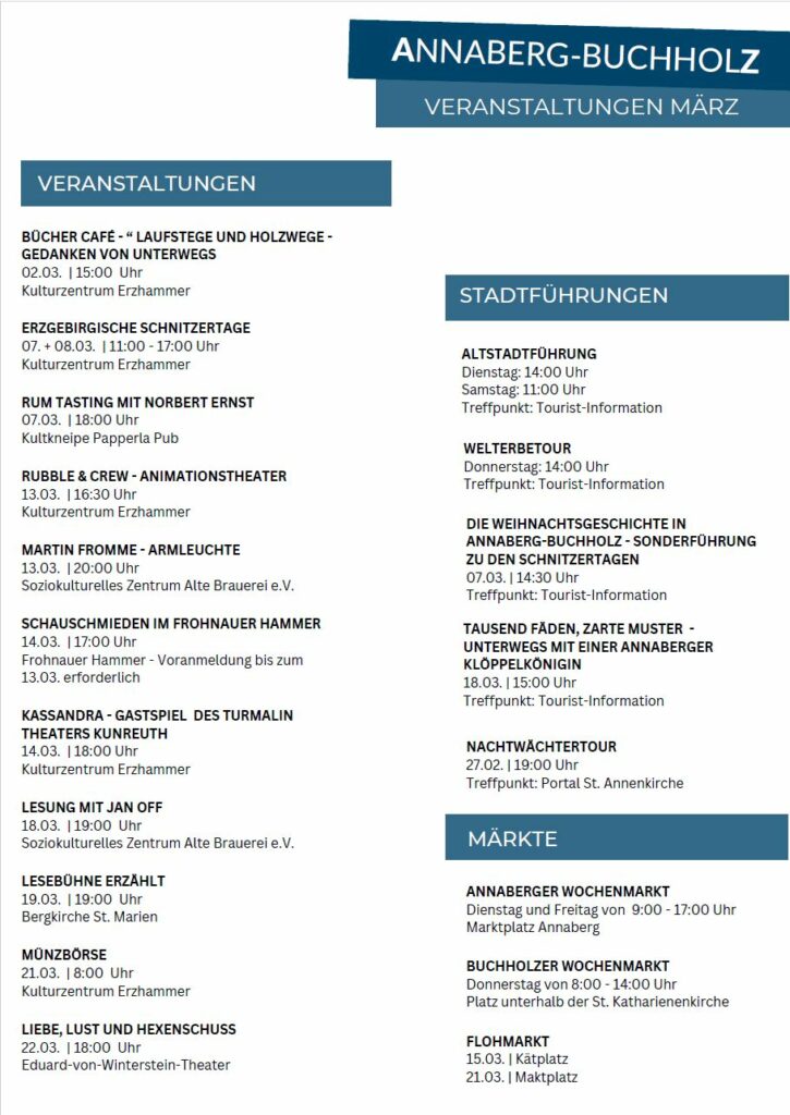 In Annaberg-Buchholz im Erzgebirge erwartet Sie das ganze Jahr über ein vielseitiges Programm, das von tief verwurzelten Traditionen bis hin zu modernen Kulturhighlights reicht. Im Jahr 2026 steht zudem das 525-jährige Stadtjubiläum des Stadtteils Buchholz im Fokus der Feierlichkeiten.